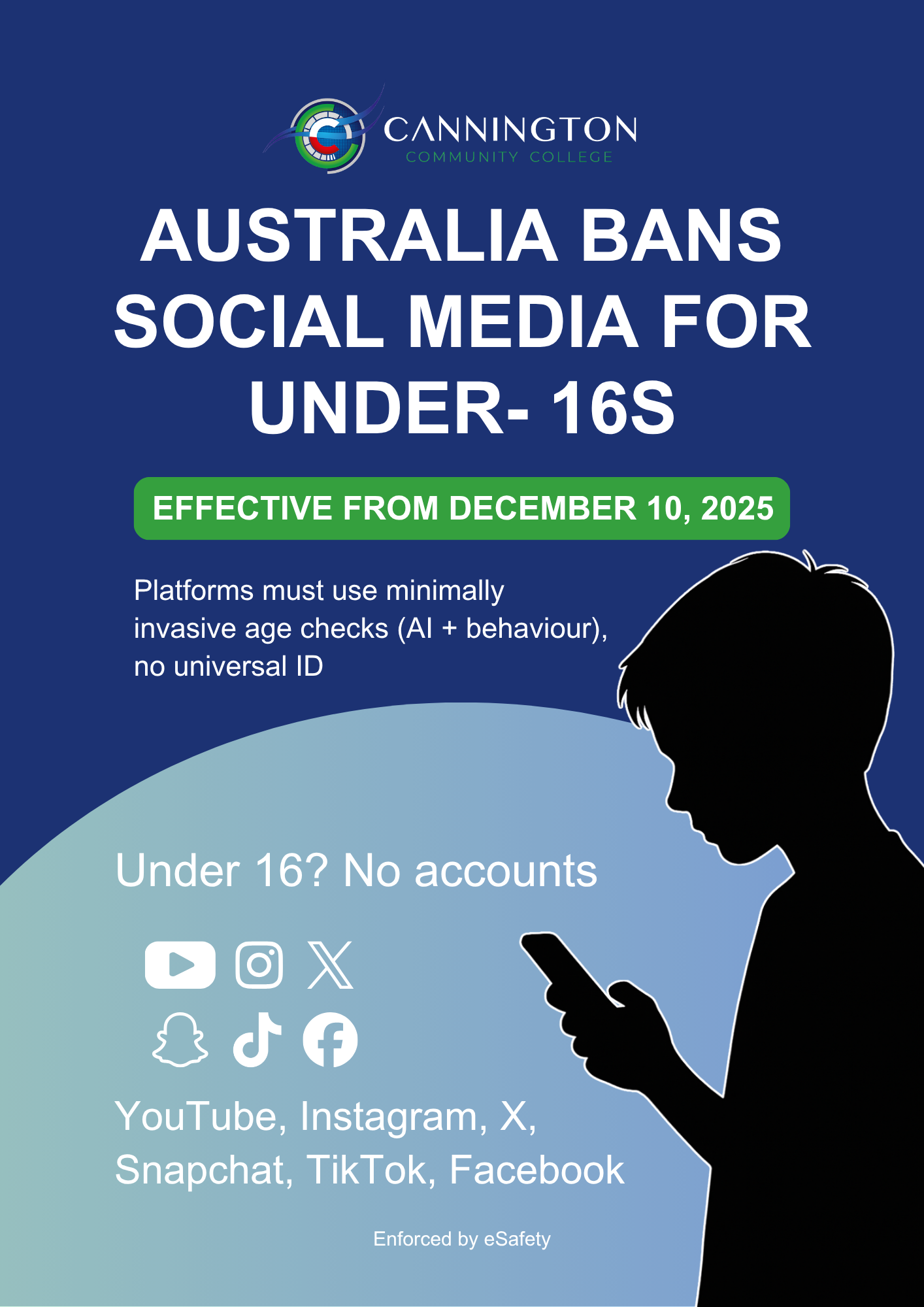 From 10 December 2025, new social media age restrictions will come into effect across Australia. These changes are designed to help children under 16 develop important online safety skills and maturity before using social media platforms.